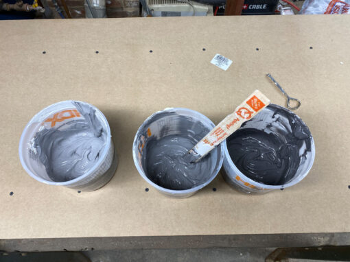The grey panel was finished in faux-concrete created using cement dye and drywall compound with a large trowel. This was combined with 12×24″ slate floor tiles to make a dark, industrial (some would say ominous) prison look. The other panel was a stucco finish created with fine sand, drywall compound, and tan cement dye. This panel was to be used top-down so there weren’t other pieces needed.